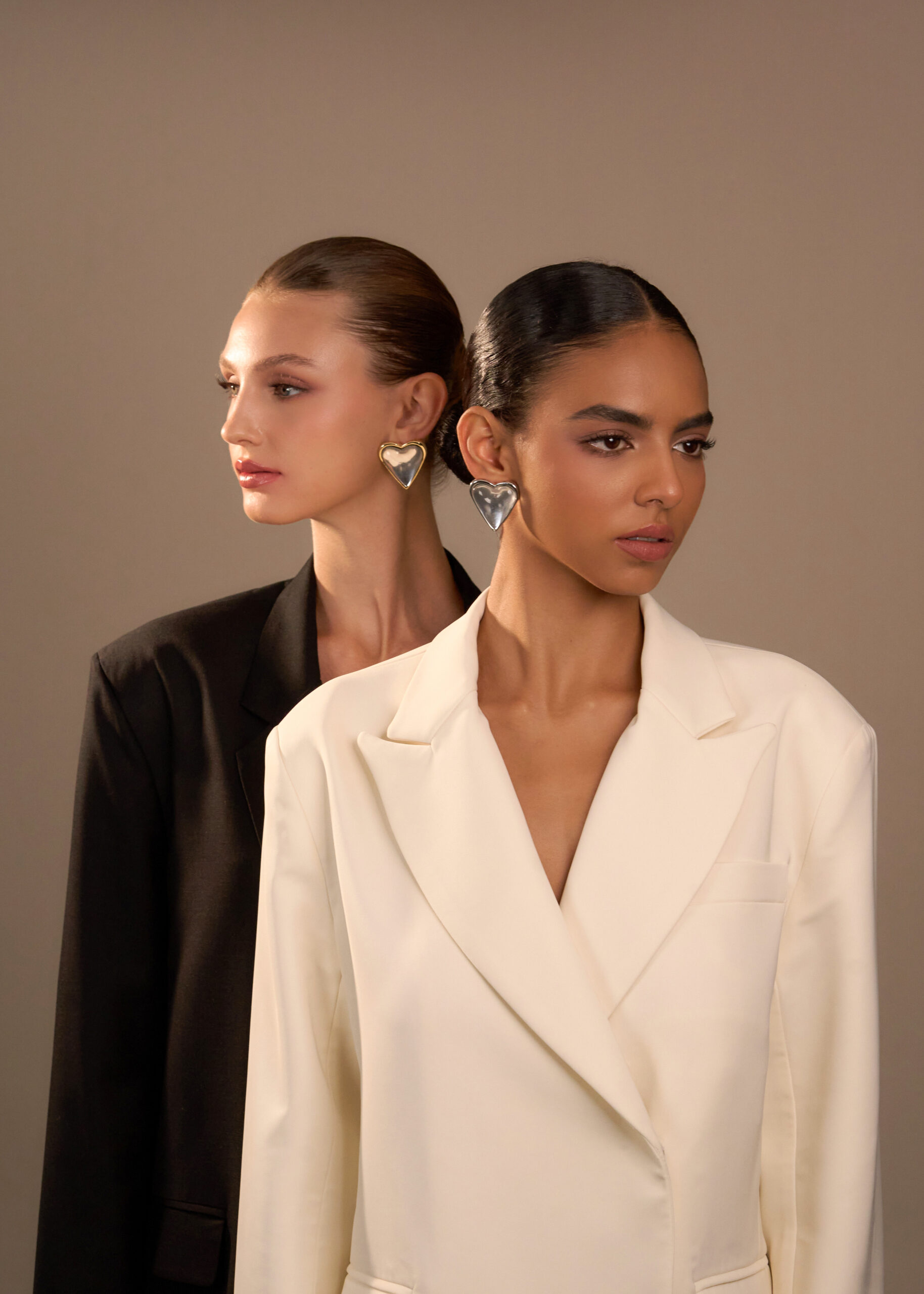 A luminous silver-toned heart sits within a minimal contour, creating a crisp, contemporary profile. Its 40 × 36mm dimensions and substantial weight make it a standout statement piece.