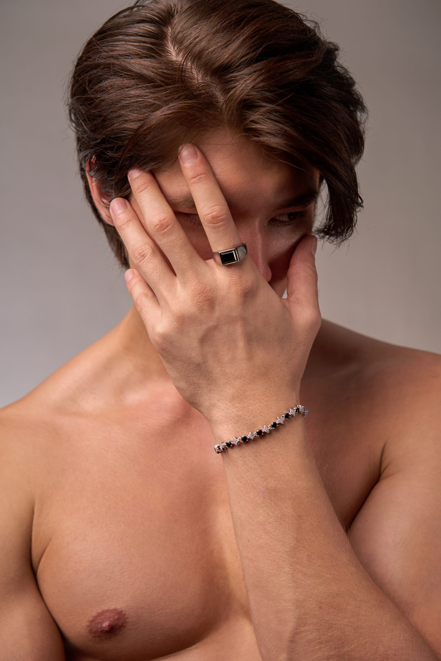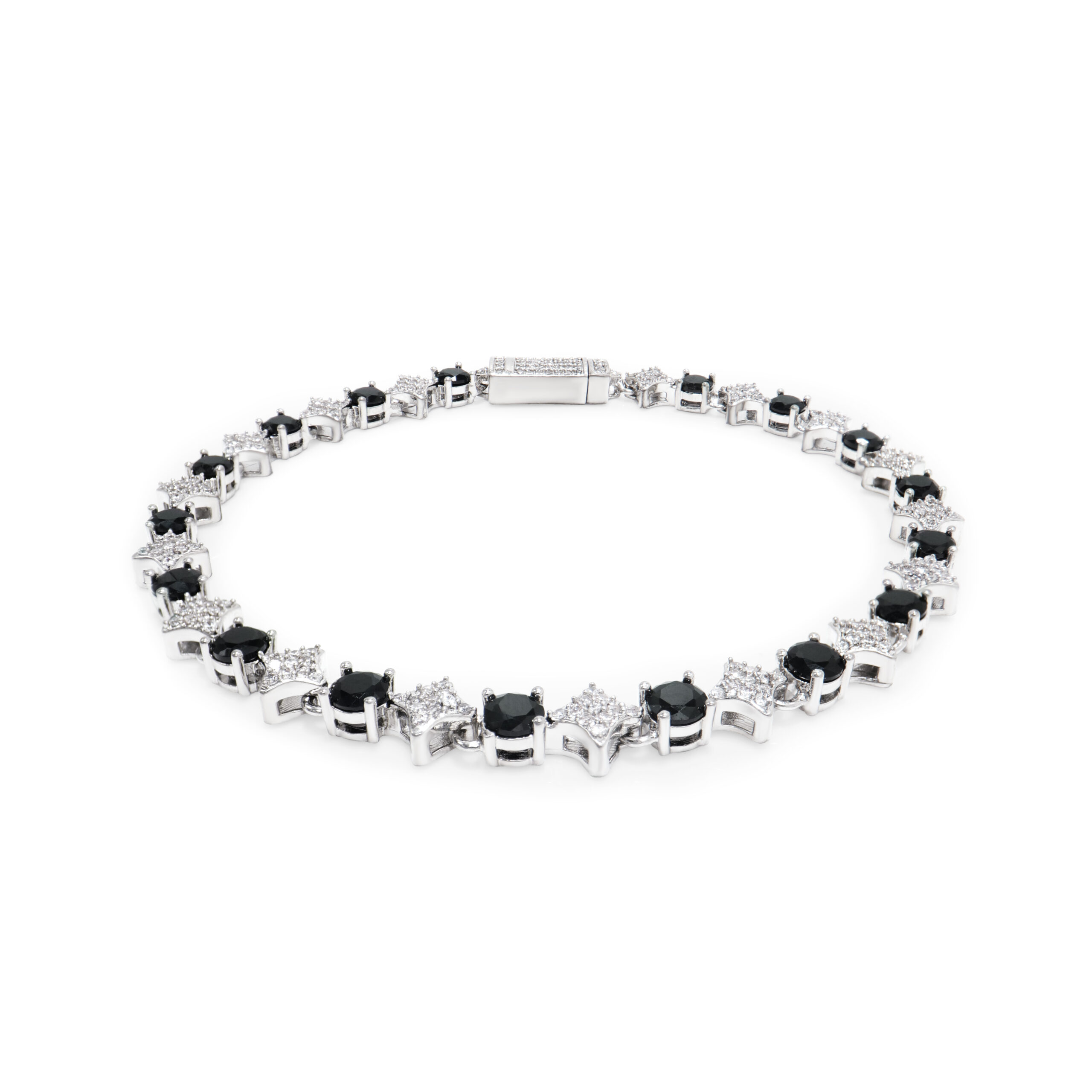 Silver-iced stars. AAAAA+ black zirconia. Palladium–platinum–silver plate. 13–15g. 18–20cm. A sleek, balanced bracelet with a crisp, luxury finish.