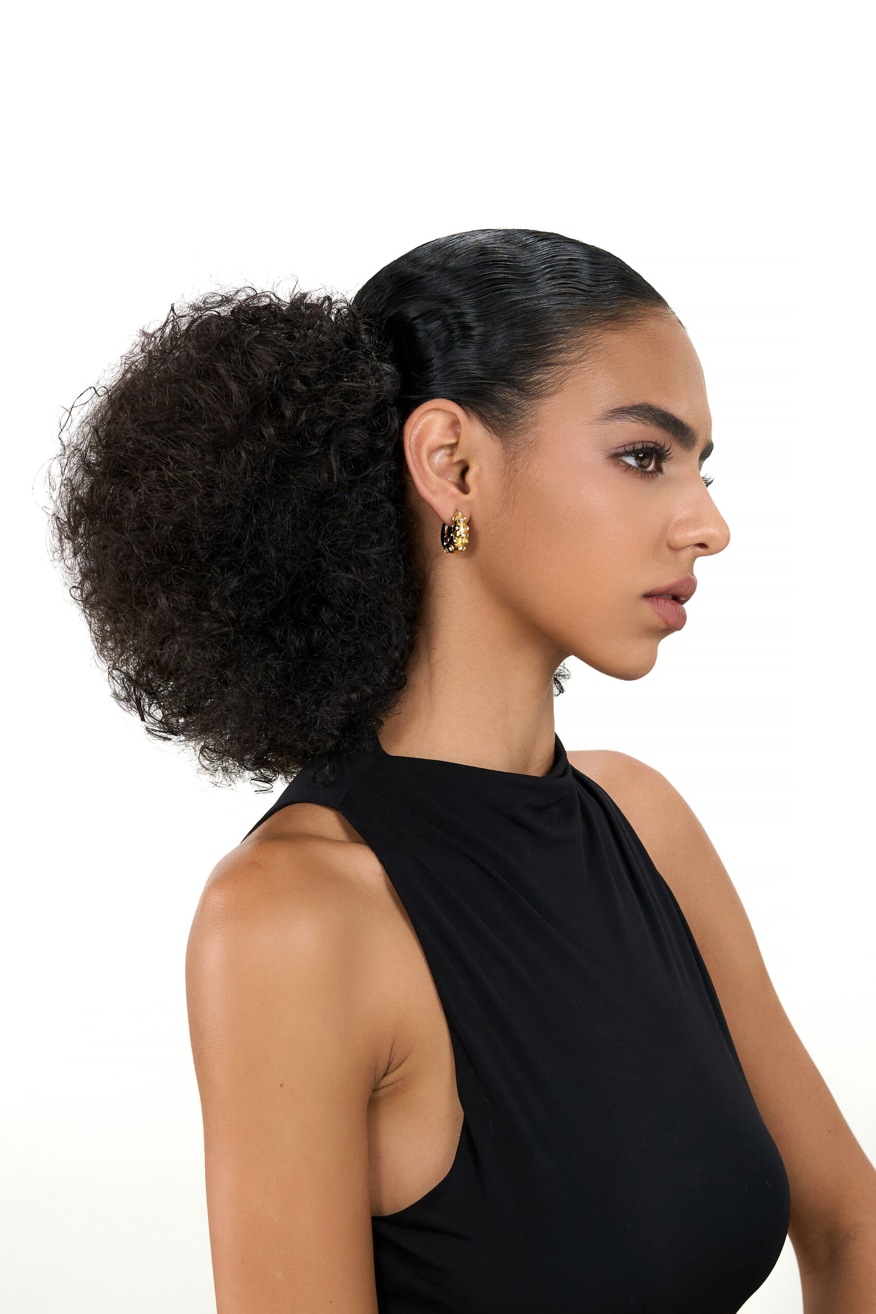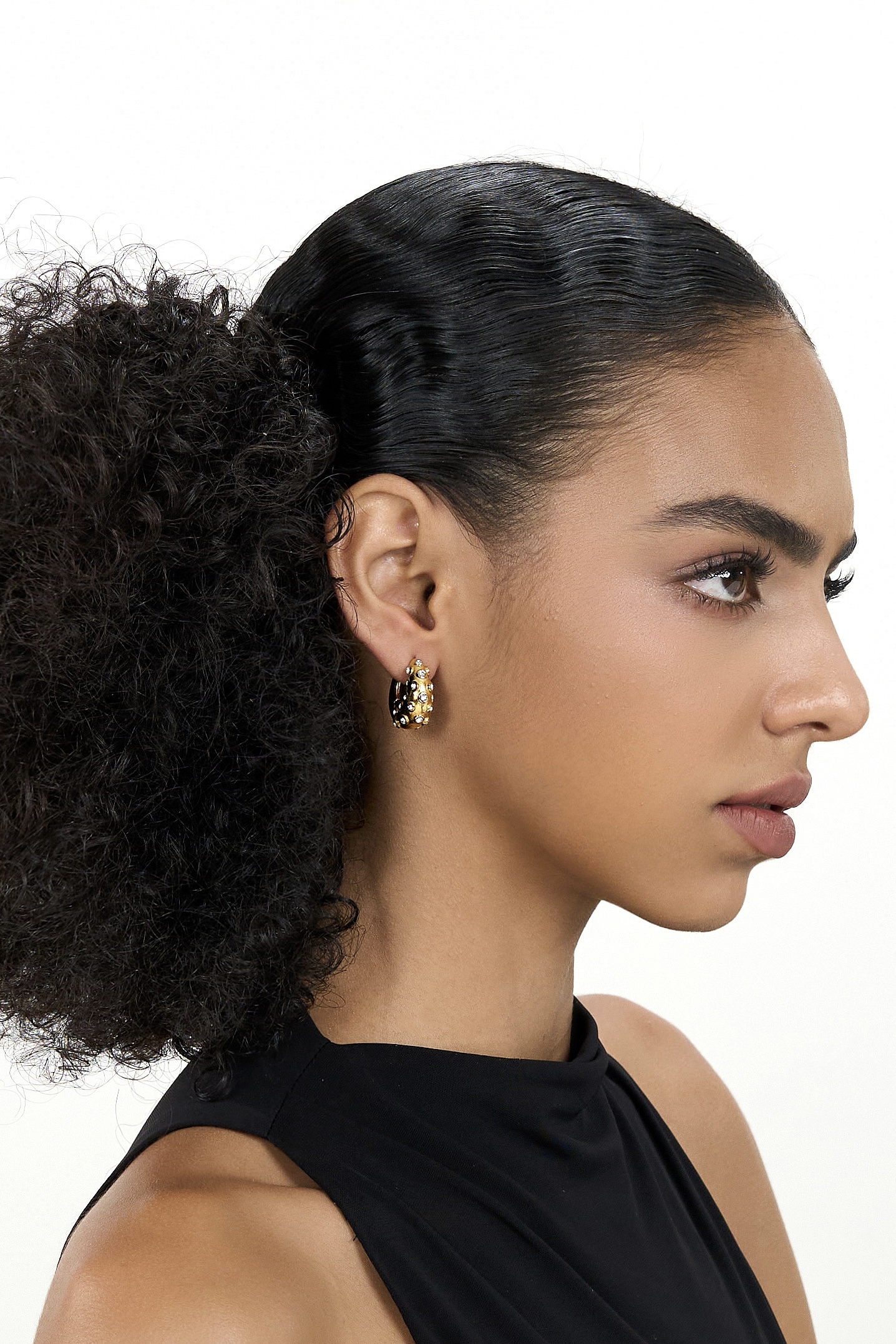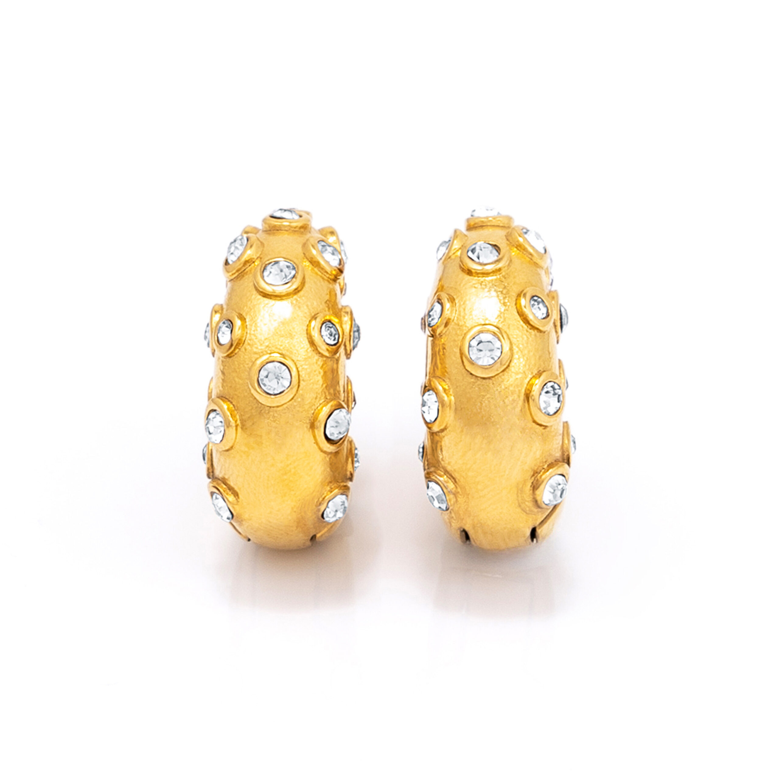A rounded 18K gold–toned hoop dotted with bright zircon stones for a striking, elevated look. Durable stainless steel and a solid 13.4g weight make the Elsa earring a confident, glow-forward statement.