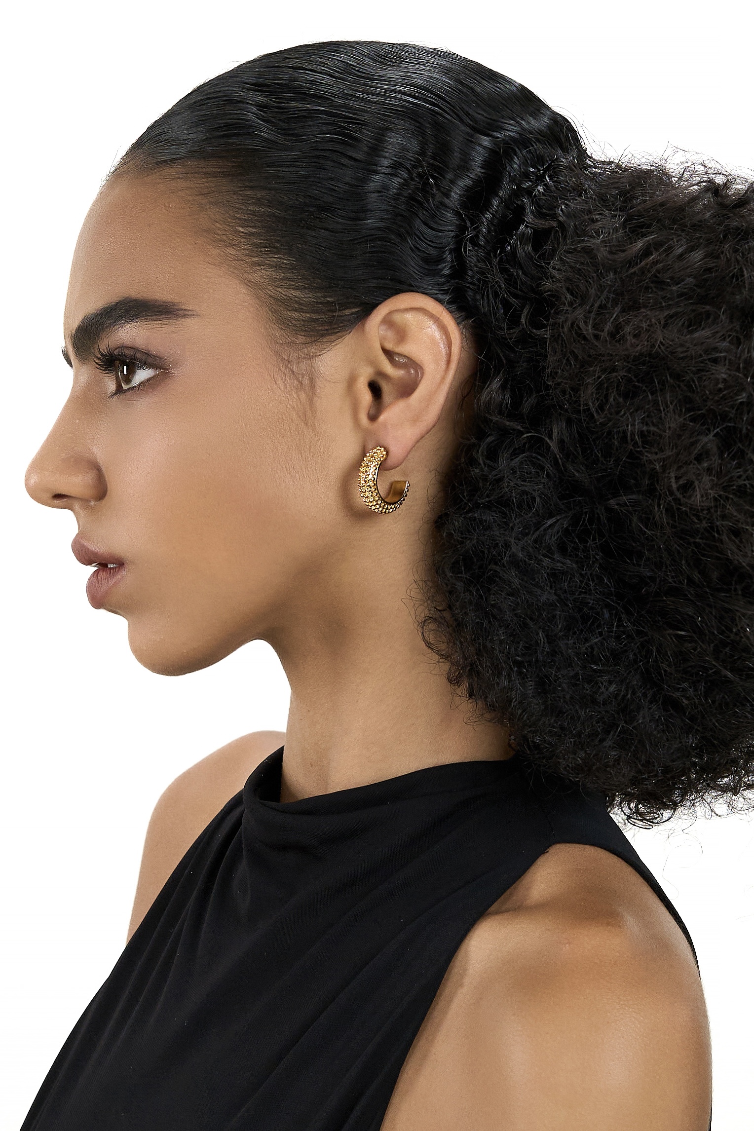 A richly detailed beaded gold hoop that catches light from every angle. Built from durable stainless steel with zircon accents, this 15.5g silhouette offers strong presence with elevated shine.