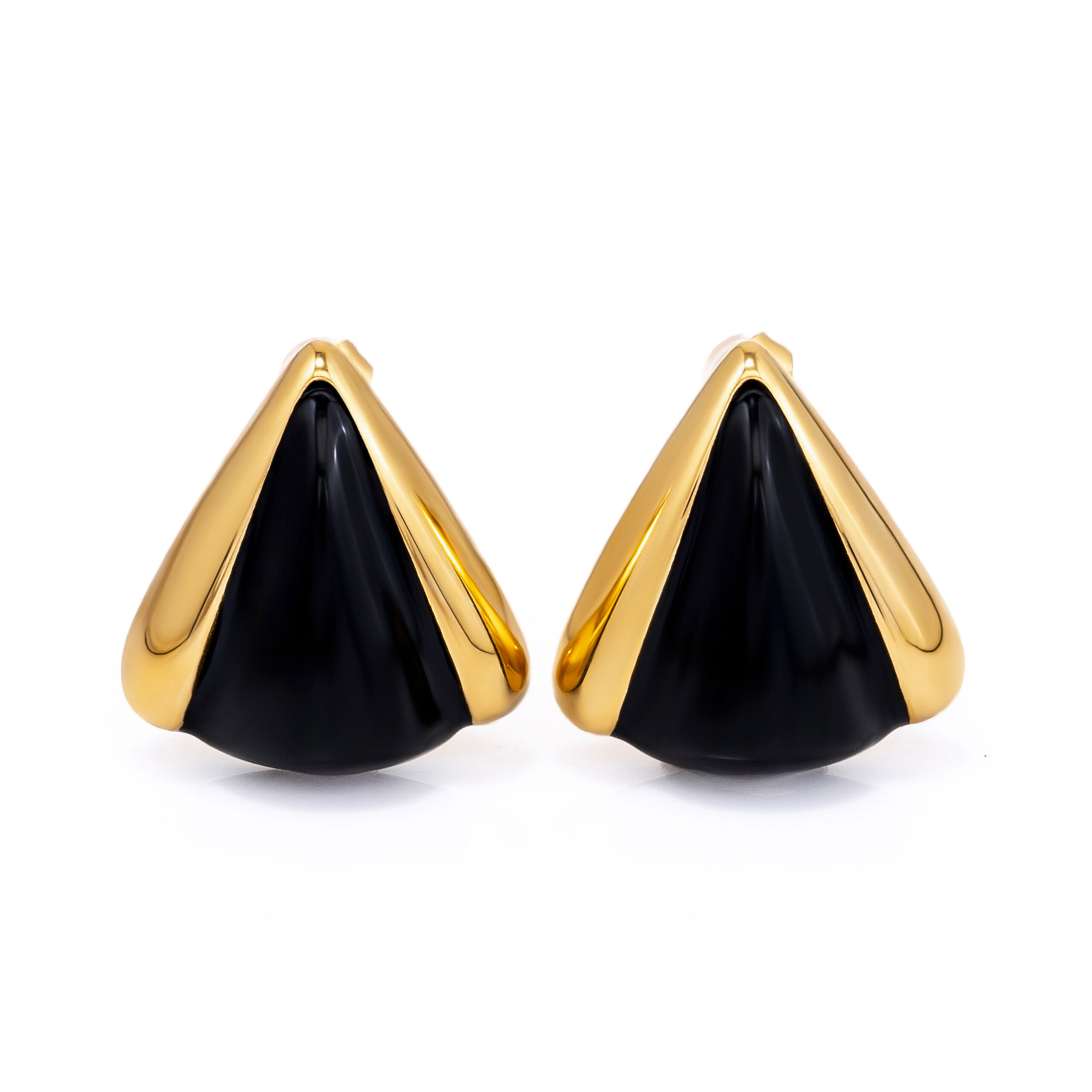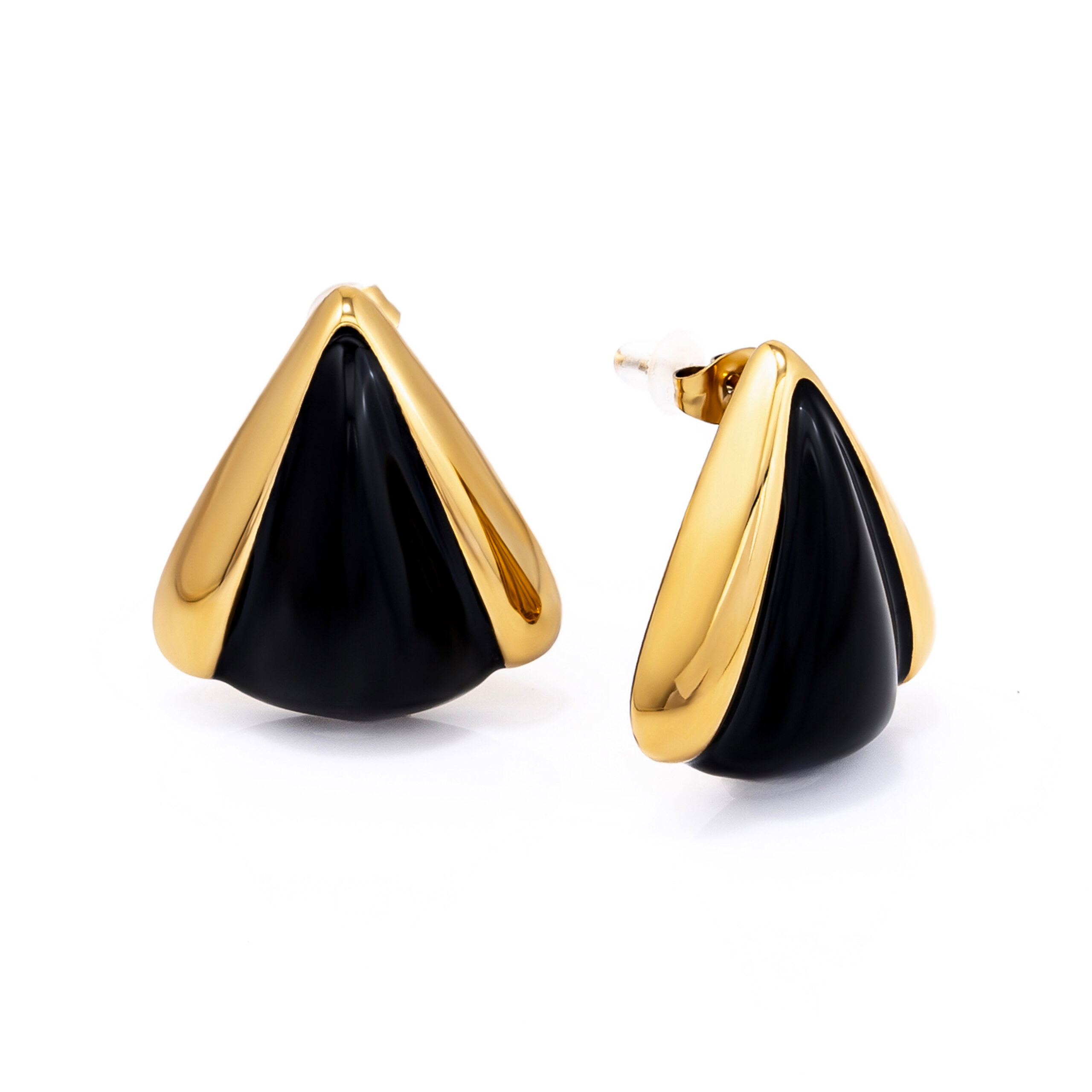 A striking blend of deep black and polished gold. These stainless-steel studs feature a sharp, sculptural form and durable electroplating. At 16.5g and 26 × 25mm, they make a confident, high-impact statement.