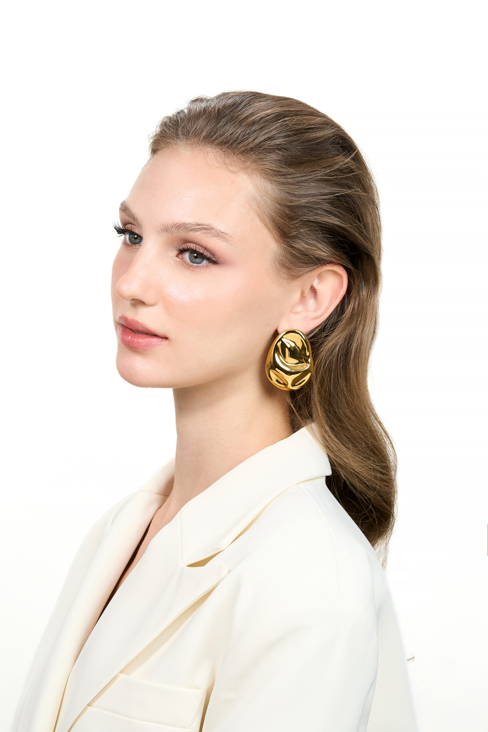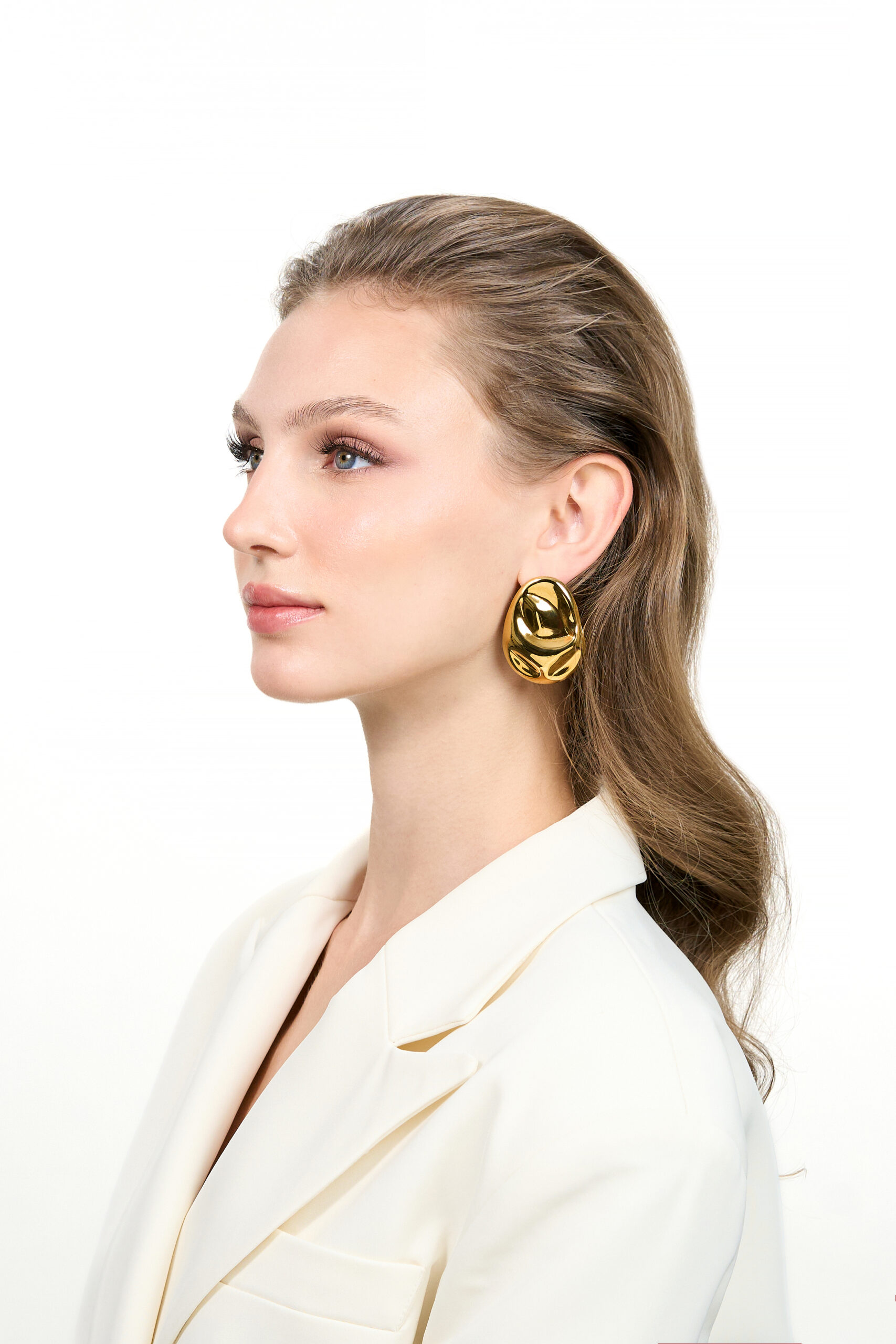 The Sena Earring brings a fluid, molten-metal silhouette crafted from gold-plated stainless steel. At 22.3g and 36.2 × 46.9mm, it delivers a bold, modern shape with elevated shine.